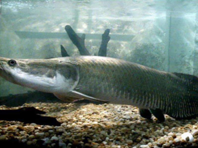 Descrição: O Pirarucu, ao lado das Piraíbas, é um dos maiores peixes que encontramos nos rios brasileiros. Chega a aproximadamente 2 metros e um peso médio, quando adulto de 80 kg., embora haja relatos mais antigos de exemplares de até 150 kg. Corpo de forma cilíndrica, largas e imbricadas escamas, e cor quase negra no dorso e avermelhada escura pelos flancos. A intensidade das suas cores entretanto varia, em função do tipo de águas em que o peixe se encontra. Em águas mais lodosas, as cores tendem mais para o escuro, enquanto que em águas claras ficam mais pálidas. E já nas barrentas ficam mais avermelhadas. Como particularidade pode-se citar o hábito de subirem de tempos em tempos à superfície para, quando não perturbados, abrirem a boca para absorver uma certa quantidade de ar, realizando assim uma respiração suplementar à da branquial. De olhos amarelados e de pupila azulada, um tanto salientes, mexem-se continuamente, como se o peixe de modo curioso estivesse observando tudo que em sua volta passa. A sua desenvolvida língua tem um osso na parte interna, acompanhando o seu formato chato e arqueado, e recoberto de conezinhos esmaltados e resistentes. Macho e fêmea tomam conta dos filhotes. A sua carne é bastante deliciosa, e devido a isso quase foi extinto pelos pescadores profissionais. Felizmente hoje ja pode ser reproduzido em cativeiro. A sua pesca, devido ao seu tamanho, é bastante esportiva. Deve ser sempre solto, de modo a espécie seja preservada nos seus locais de origem.